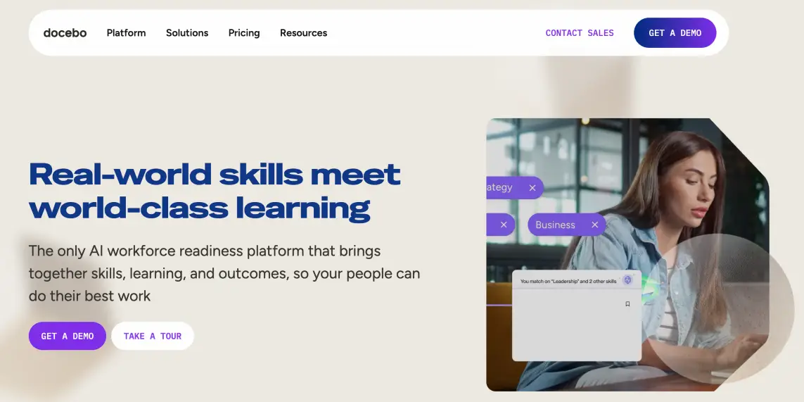 - Personalized Learning Journeys: Creates customized learning paths that match employee' skills and job needs to their current ability level.