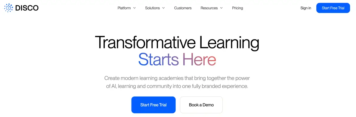 Disco offers cohort-based learning management solutions that enable organizations to develop interactive educational programs, community centers, and branded academic institutions through its collaborative tools, AI content production system, and user-friendly engagement solutions.