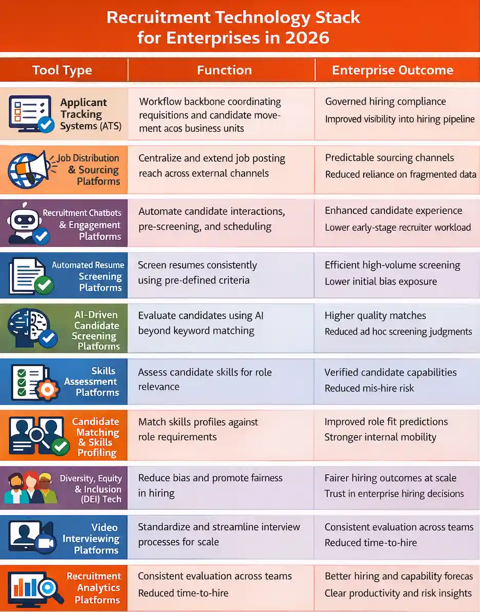 Below are the ten recruitment technology categories enterprises rely on in 2026, rewritten through an enterprise operating-model lens.