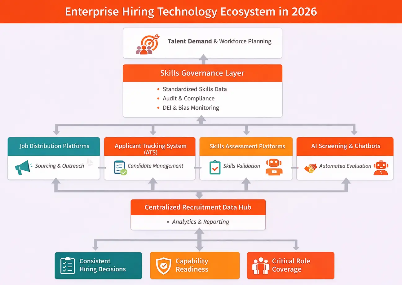 At enterprise scale, recruitment technology is not a collection of isolated tools. It operates as an integrated layer connecting sourcing, screening, skills validation, and analytics across ATS, assessment platforms, CRM systems, and HCM environments.
