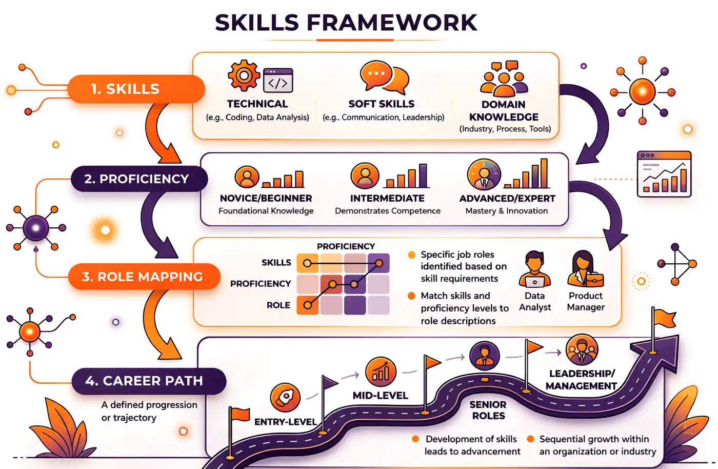A well-defined skills framework provides a structured approach to identifying, organizing, and developing the capabilities required for each role. By clearly defining skills, establishing proficiency levels, and mapping them to job functions, companies can align talent with business goals and build a future-ready workforce.