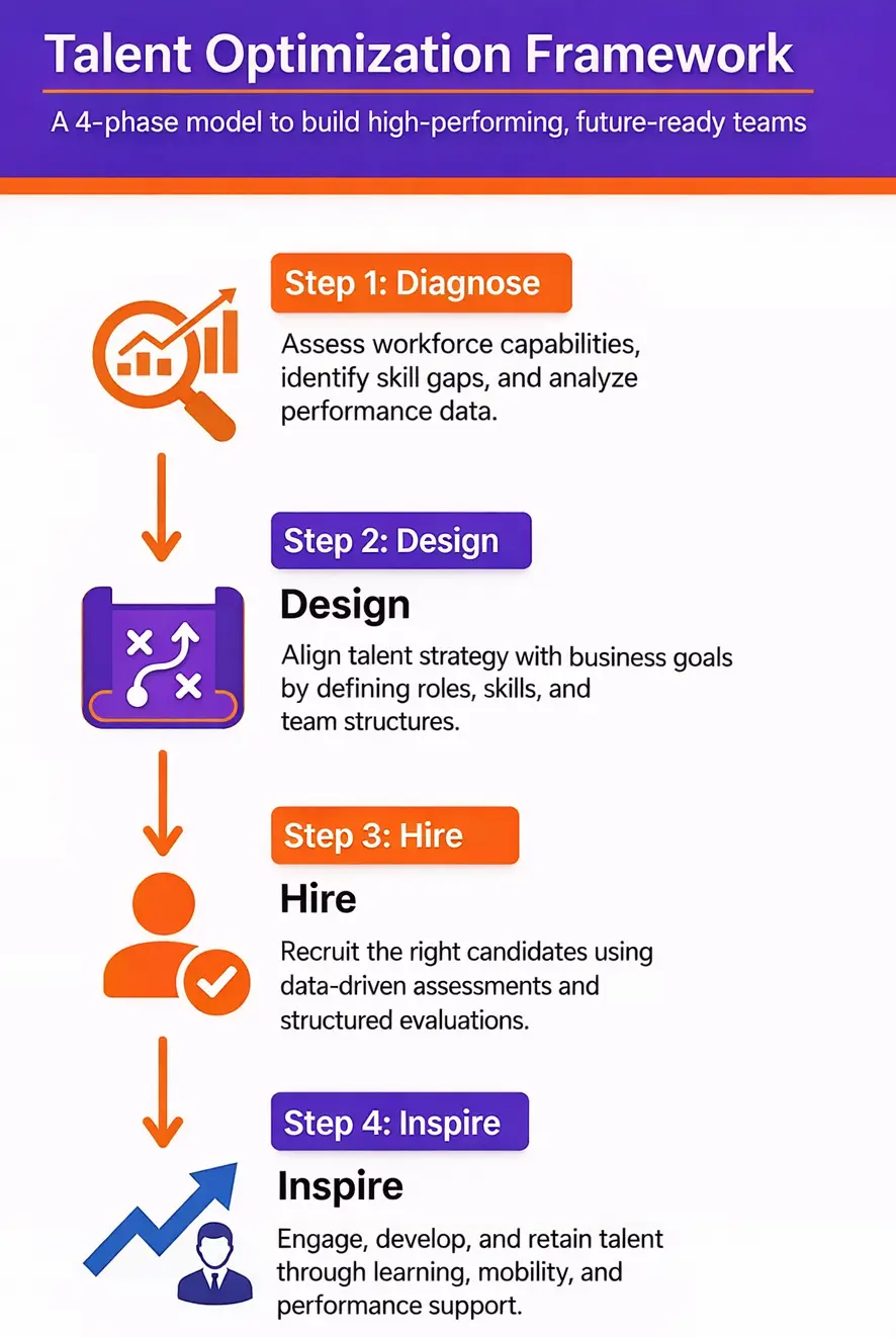 Talent optimization helps organizations improve workforce performance by ensuring employees are aligned with the right roles, equipped with the right skills, and continuously developed to meet business goals.